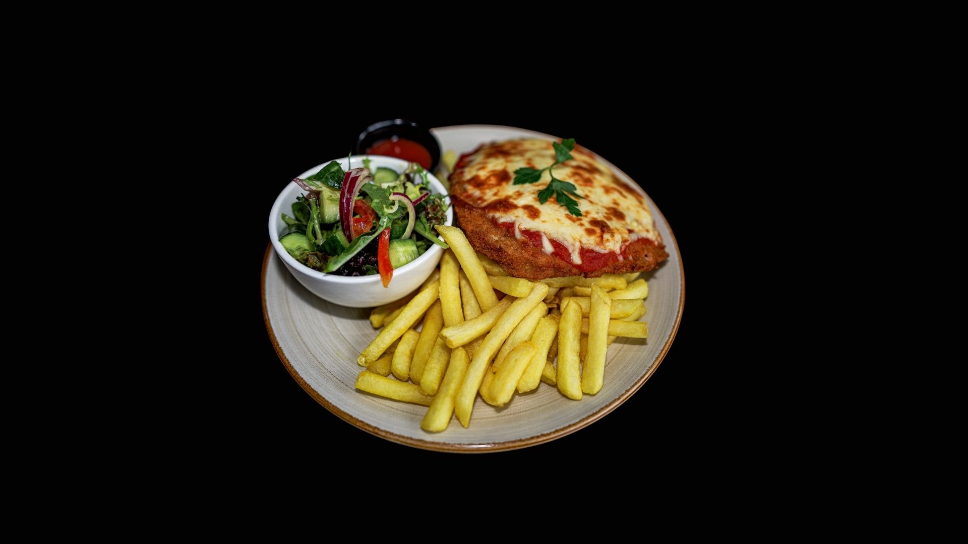 House Crumbed Chicken Breast Fillet With Rich Tomato Sauce And Melted Cheese. Served With Chips, Option: Salad Or Vegetables.